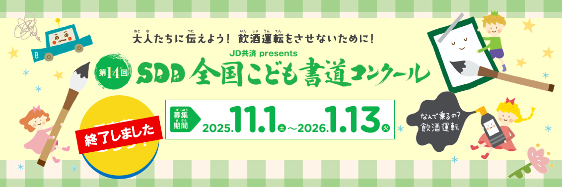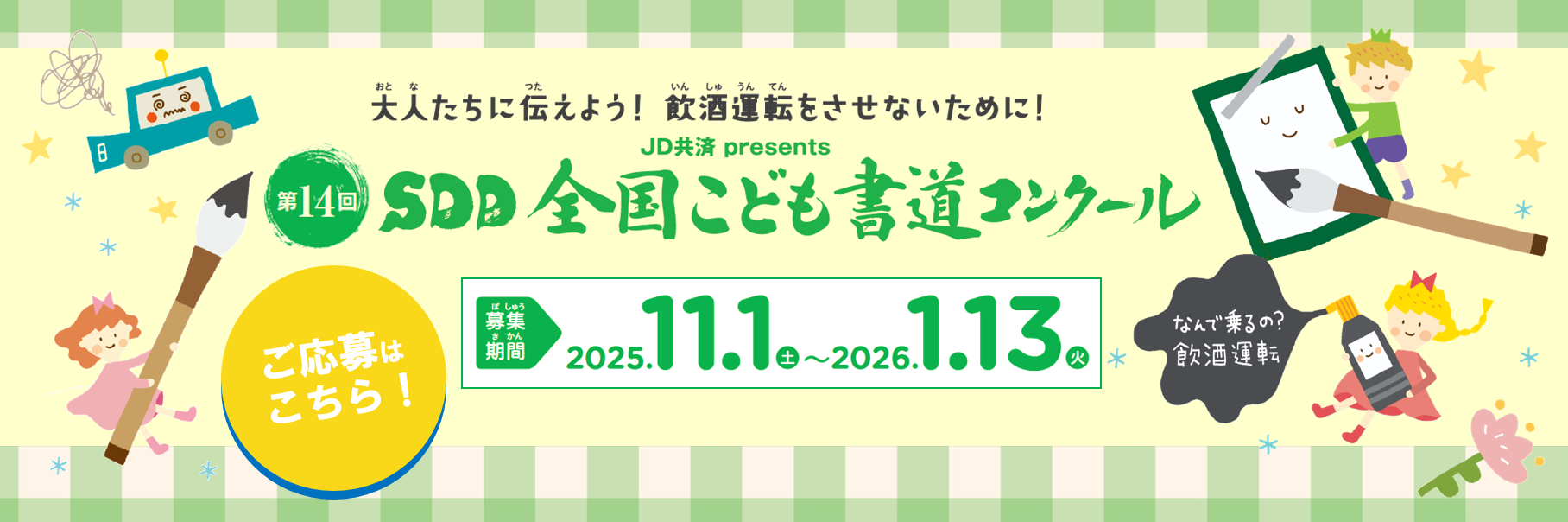 そしてSDDプロジェクトの中で「飲酒運転撲滅の啓発活動の一環として、飲酒運転をやめない大人たちへ、子どもたちからのメッセージを込めた作品を応募してもらう」というSDD全国こども書道コンクールを2012年より主催しています。このコンクールは、飲酒運転撲滅という社会貢献活動であるとともに、飲酒運転撲滅の担い手である「運転代行」の利用促進に寄与するものです。
