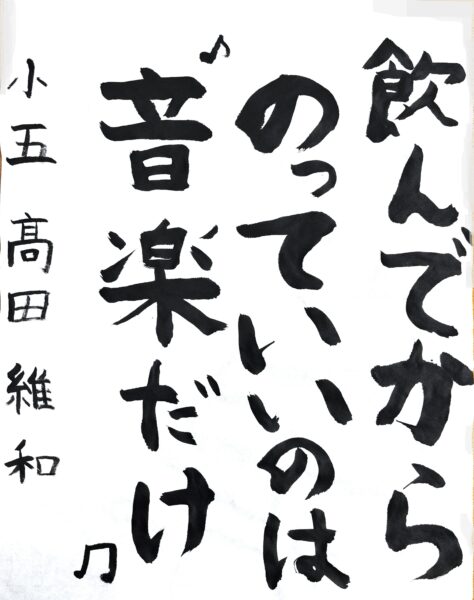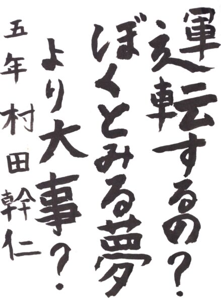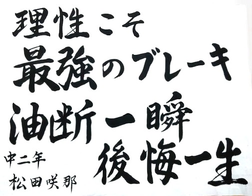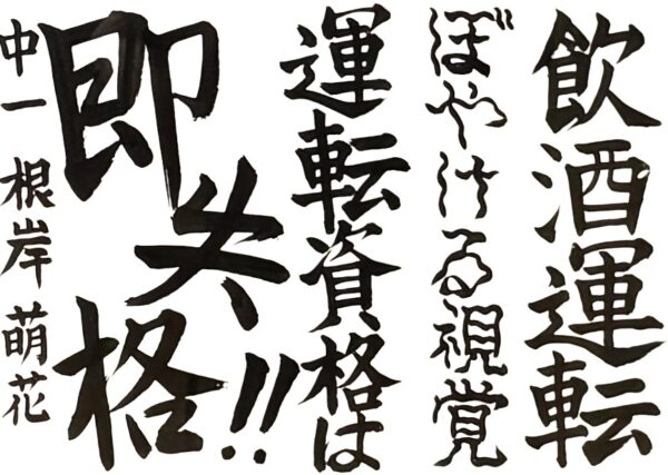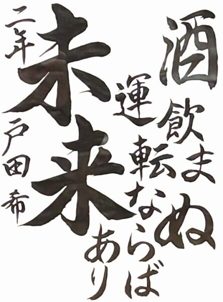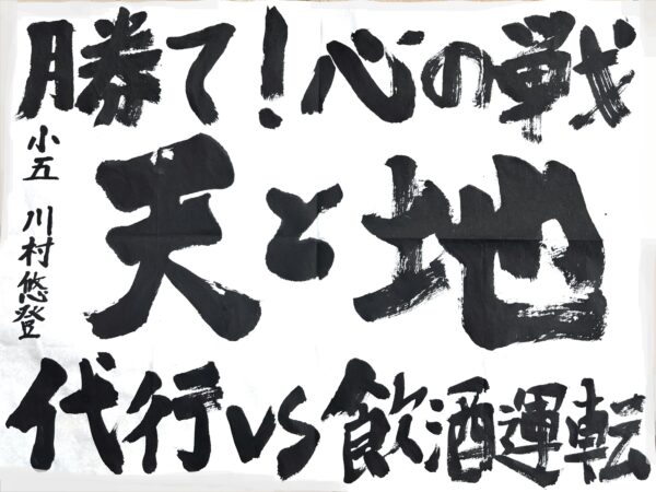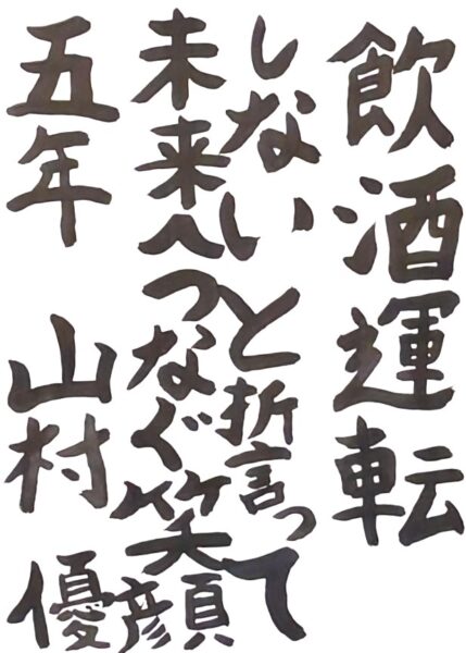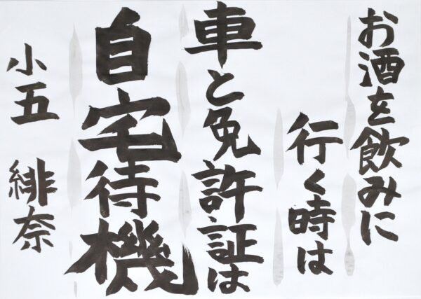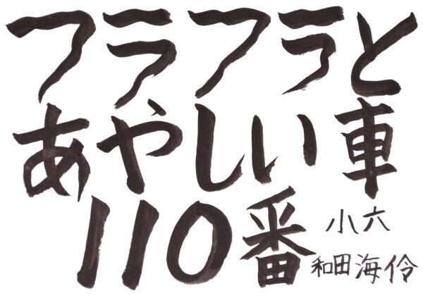 和田 海伶さん(小6) 「フラフラ」という字を工夫し、ふらついている車を見かけたら迷わず110番通報をしてほしいという思いを表現しました。